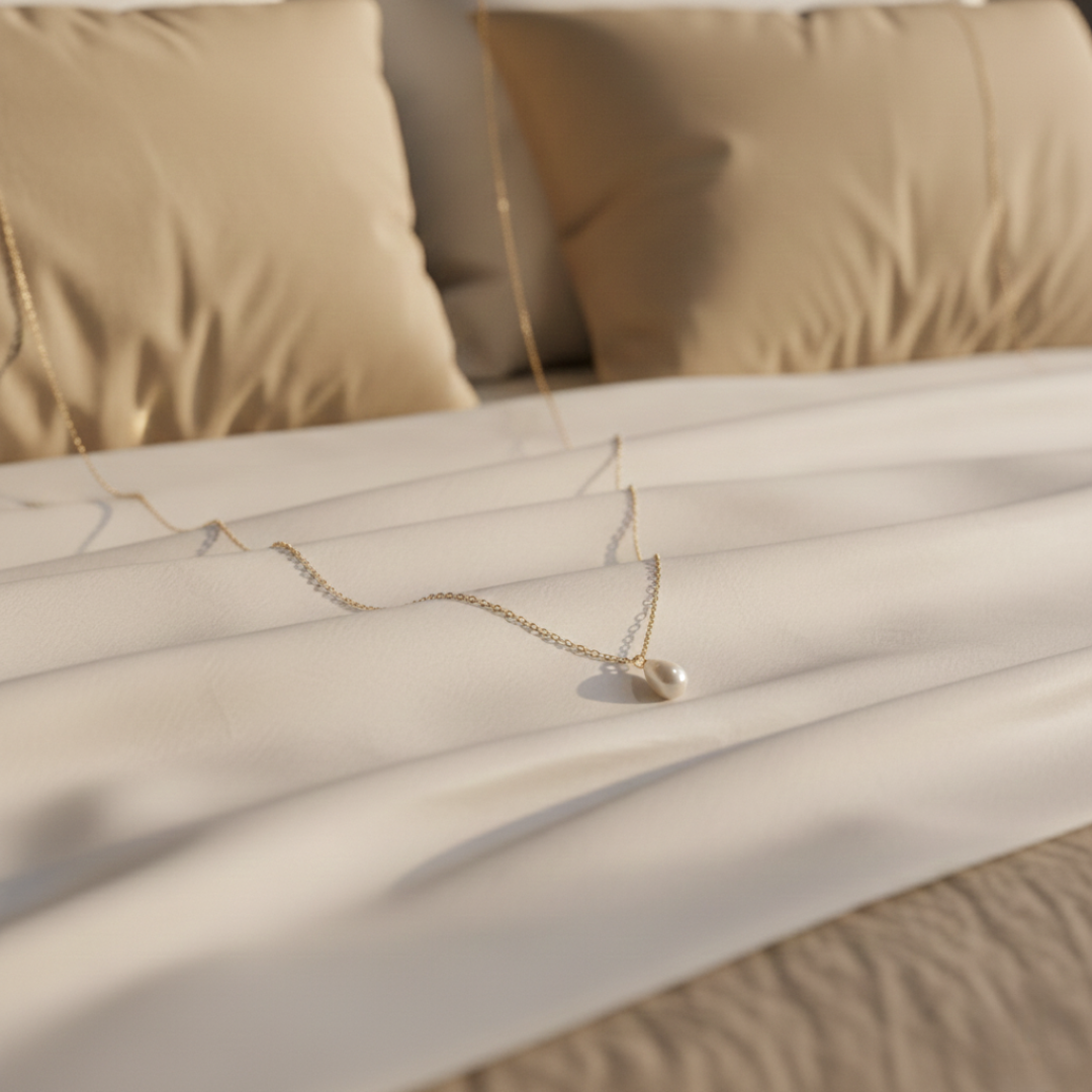 Selma er et halskjede som fanger den varme, organiske skjønnheten i en ekte barokk ferskvannsperle. Hver perle er unik i formen, med en naturlig glød som reflekterer lyset på en myk og sofistikert måte. Den tynne gullbelagte kjeden gir smykket et delikat og feminint uttrykk – enkelt, tidløst og uanstrengt elegant.